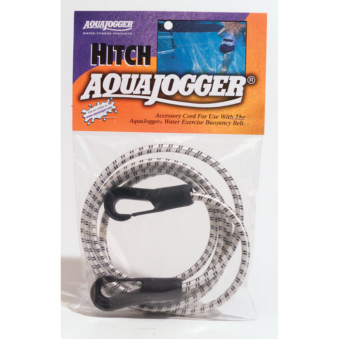 The AquaJogger Hitch is an elastic swimming harness that loops and fastens around the AquaJogger Belt. The sturdy 5' stationary swimming harness adds resistance and intensity to your aquatic workout. Special hook fasteners secure the tether in place. The Hitch includes a 60" elastic cord.